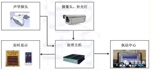 鸣笛抓拍的系统架构也很清楚,摄像头、探头,声学相机的探头连接到处理主机。